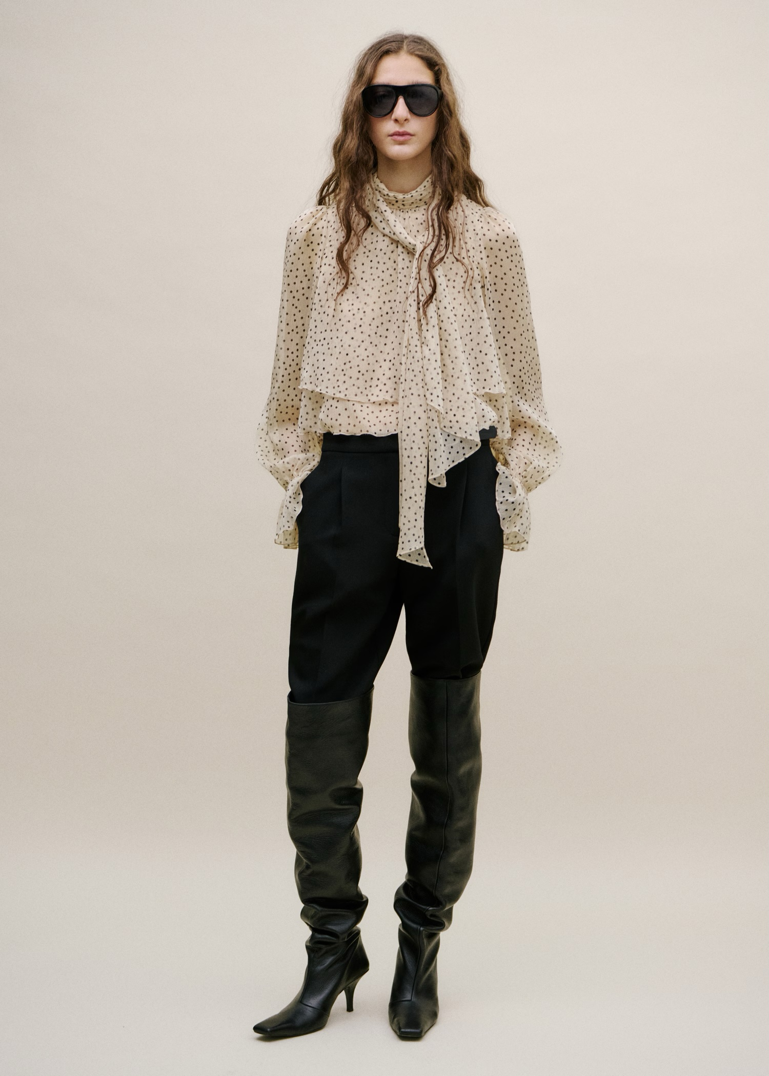 Diseño recto. Estampado de lunares. Detalle de volantes. Detalle de lazo. Manga larga con puños elásticos y fruncidos. Cuello drapeado. Cierre de lazo en la parte posterior.