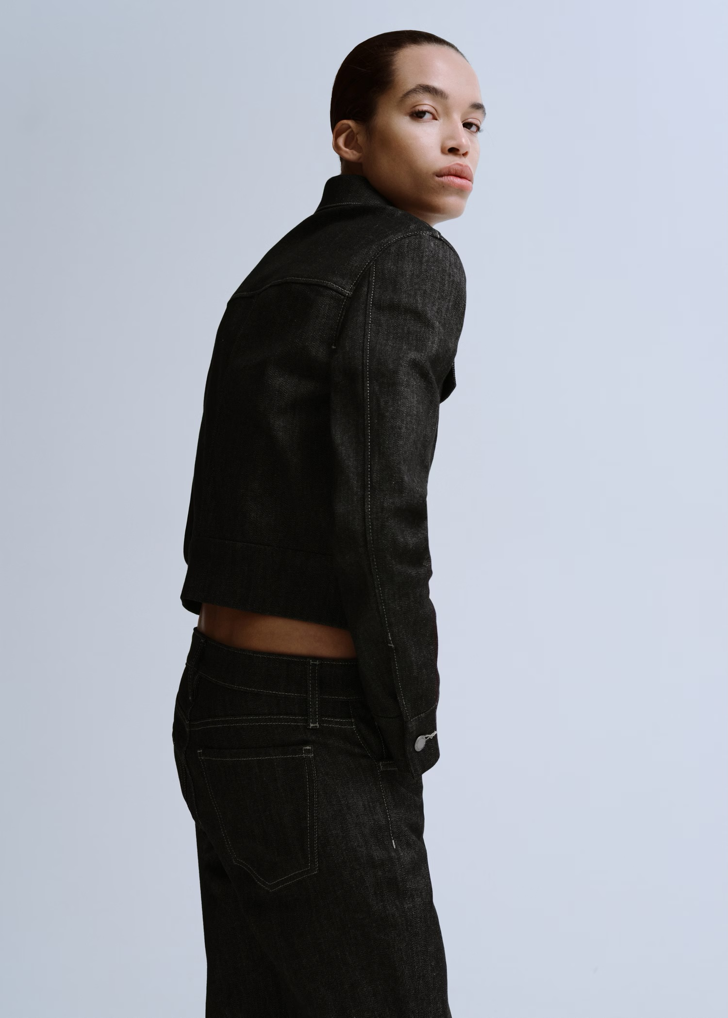Tejido de algodón estilo tejano vaquero. Diseño largo. Estilo flare. Tiro medio. Trabillas. Cinco bolsillos. Cierre de botón y cremallera.