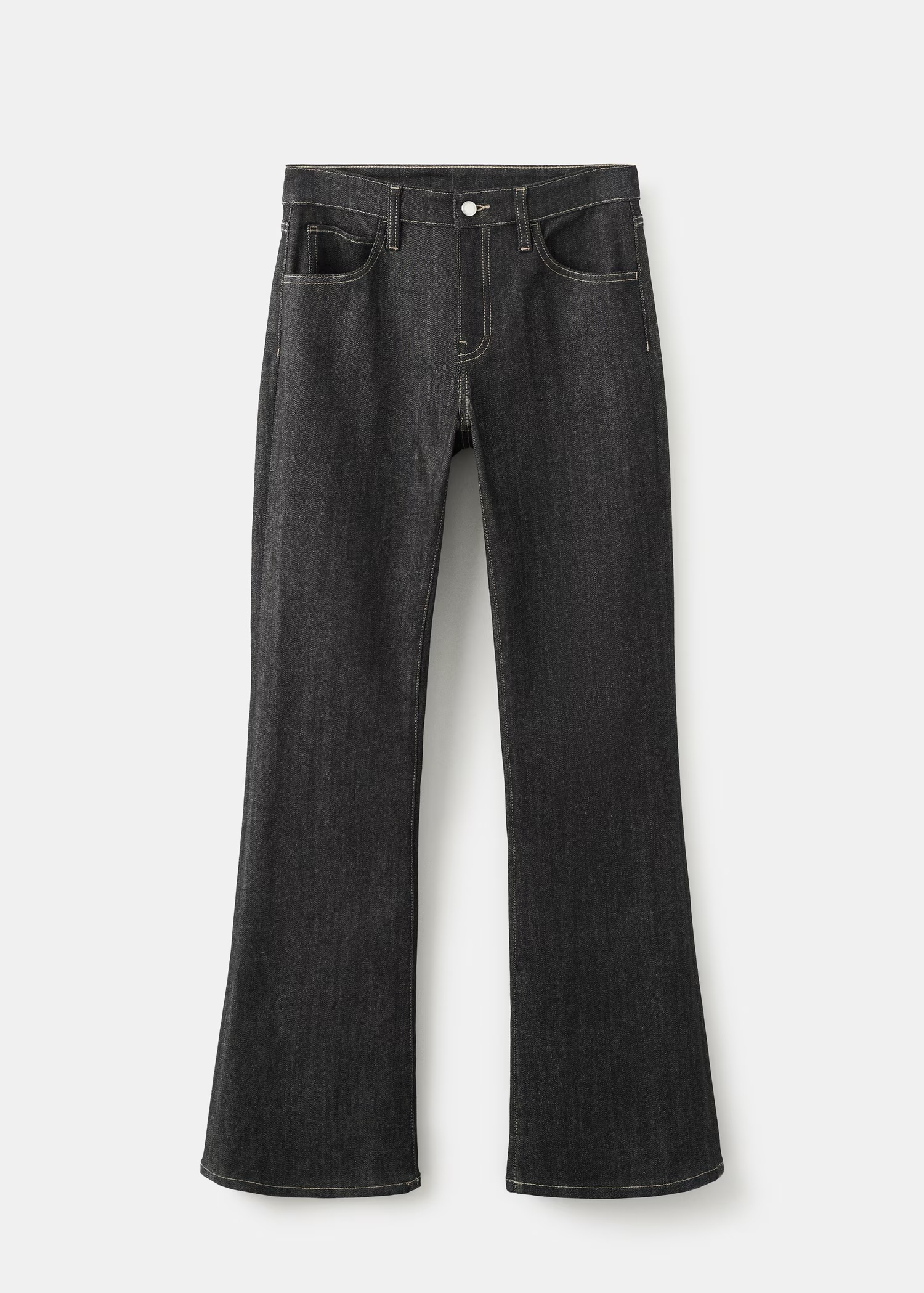 Jeans estilo tejano vaquero, flare de tiro medio y diseño largo. Un esencial que destaca por su acabado y detalles en costuras.