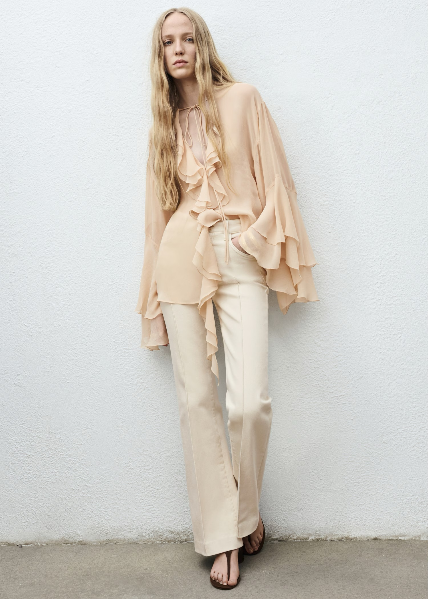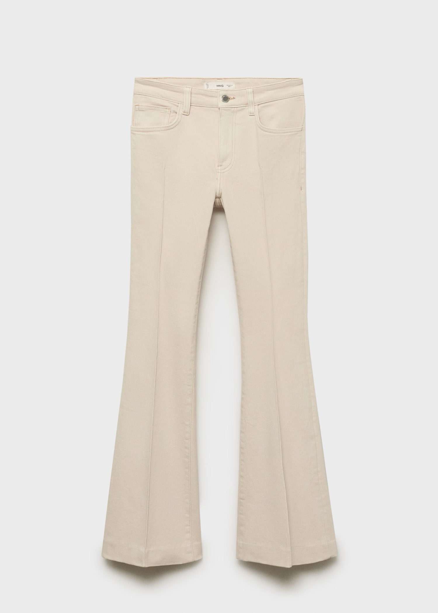 Tejido de algodón estilo tejano vaquero. Diseño largo. Estilo flare. Tiro medio. Cinco bolsillos. Cierre de botón y cremallera. Largo interior 85 cm.