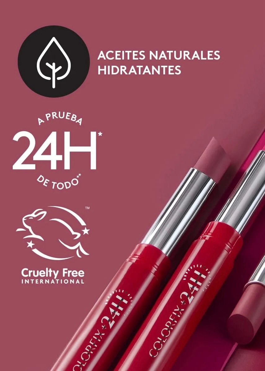 Labial mate COLORFIX 24H. 24 horas de color y suavidad*, 100% mate ¡sin retoques! Su deliciosa sensación y textura cremosa te dan comodidad todo el día. Capacidad: 2g /.07 oz.