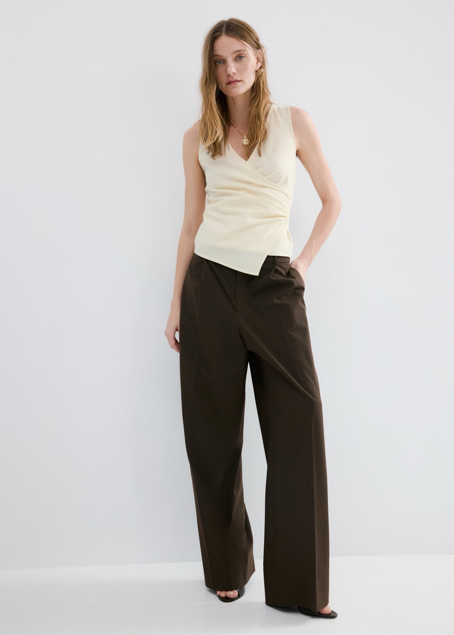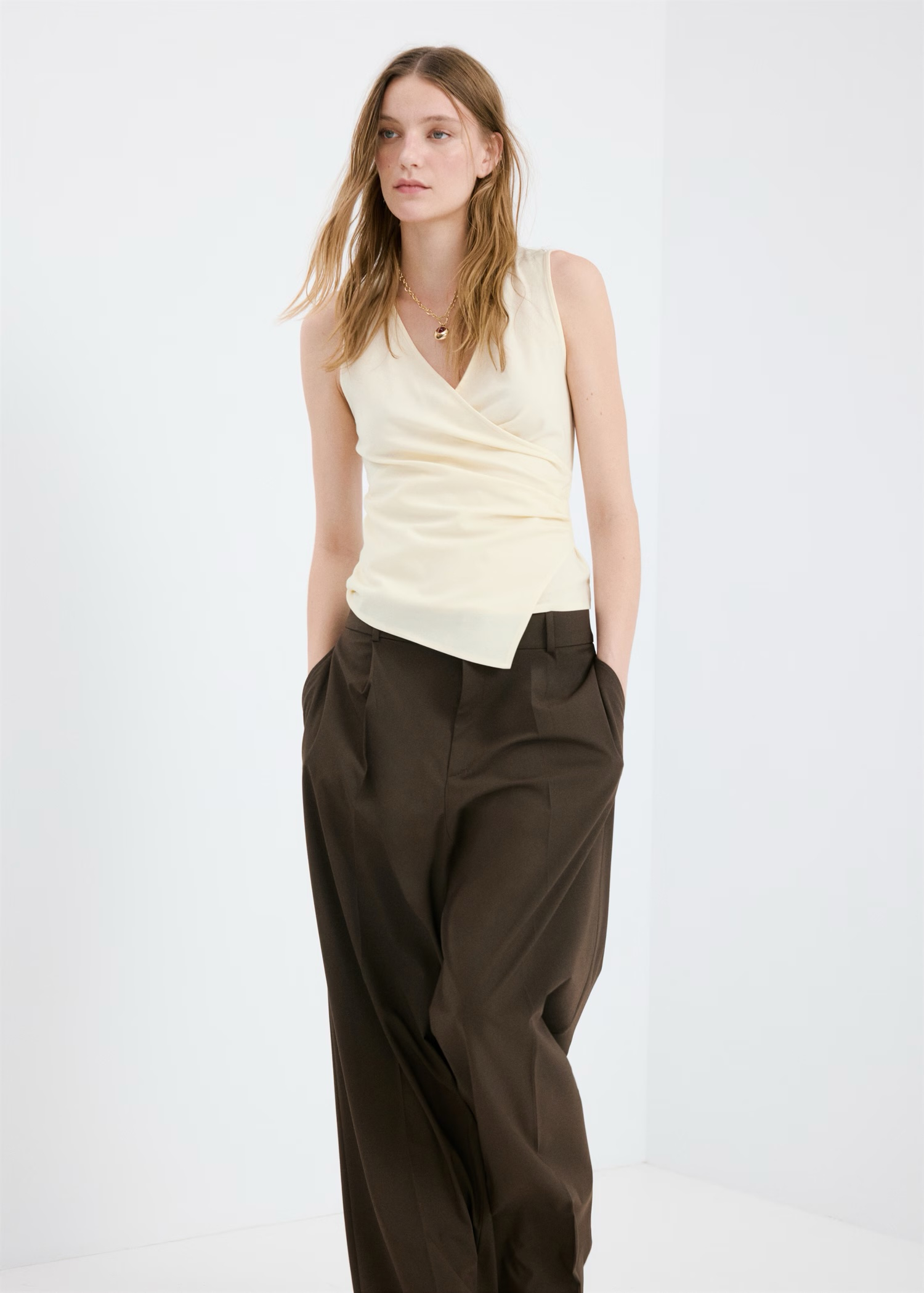 Diseño recto. Cuello de pico. Sin mangas. Tirantes anchos. Estilo cruzado. Bajo asimétrico. Sin cierre.